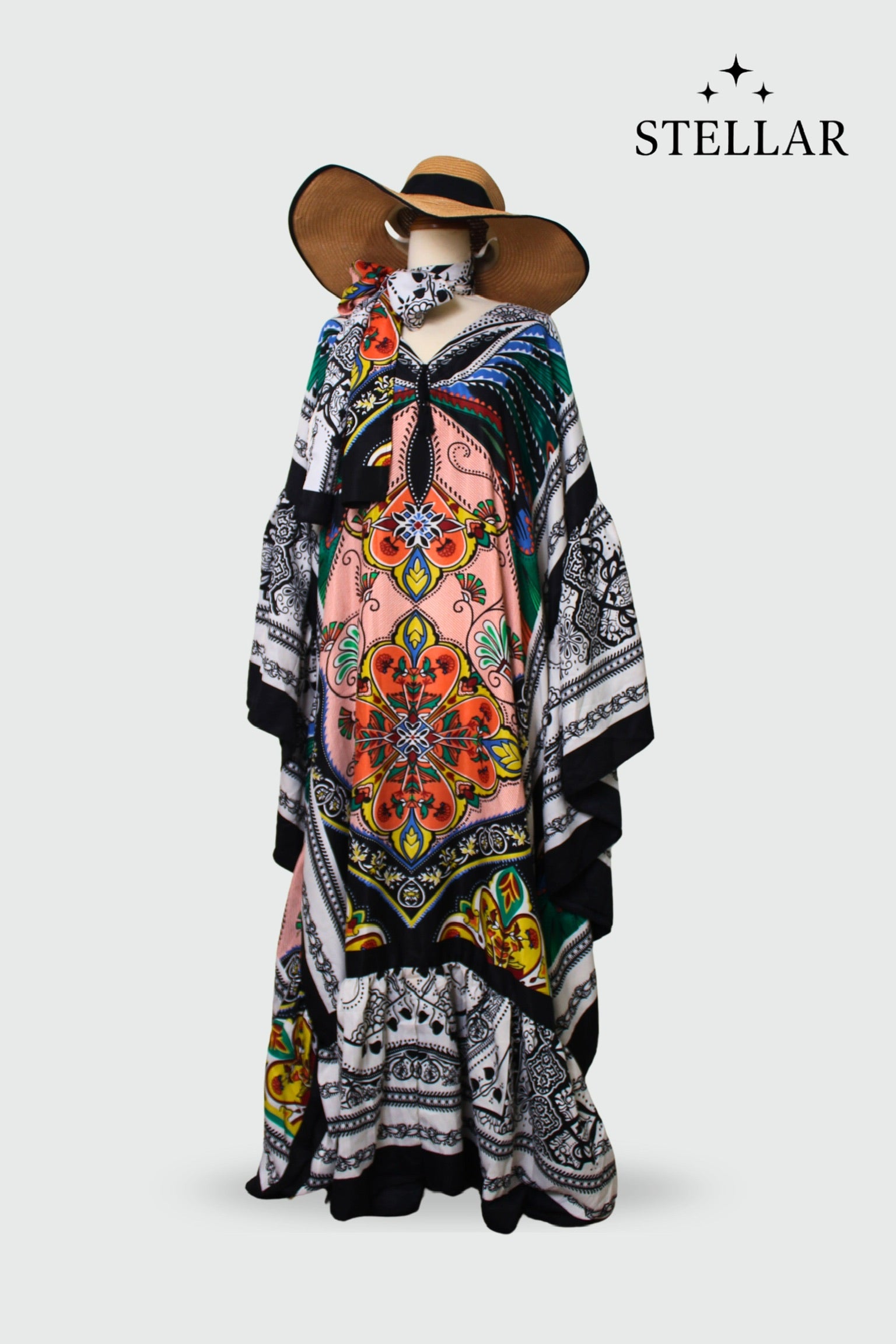 A vibrant mosaic of colors over a chic black base – perfect for festival fashion, travel style, or elevated resort wear.