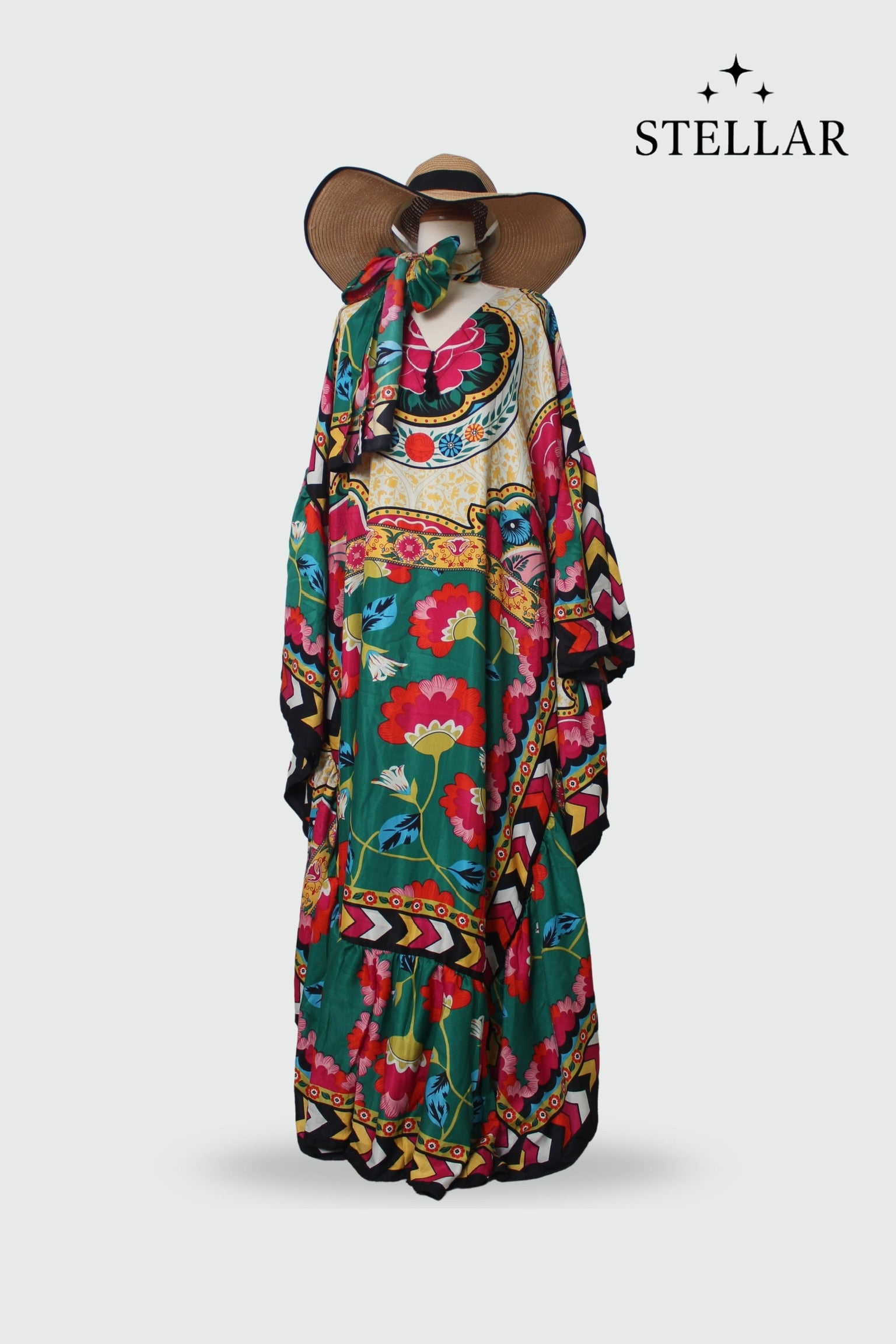 Bring island vibes and bold color anywhere you go. Vivid greens and fiery reds make this luxury flowy dress perfect for tropical escapes or summer celebrations.